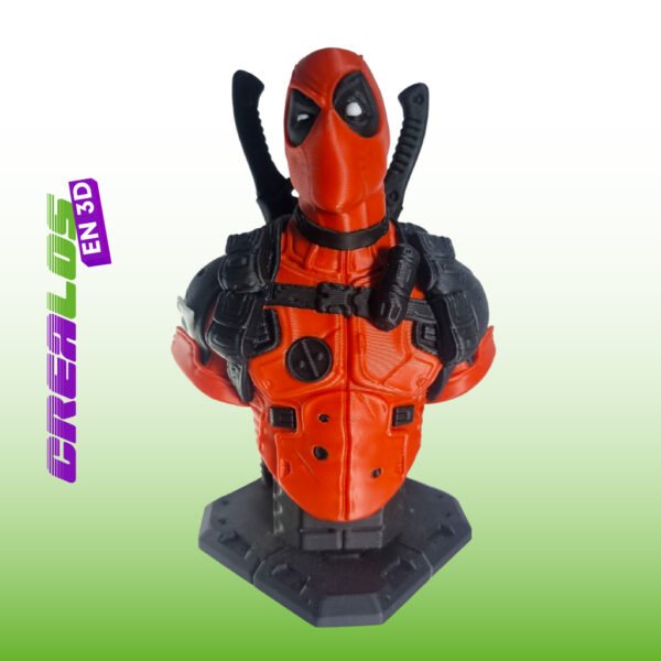 Busto de Deadpool impreso en 3D, ideal para fans de Marvel. Detallado, resistente y ensamblado a mano. Perfecto para colección o decoración.