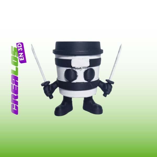 Figura 3D inspirada en Cappuccino Assassino, personaje viral del brainrot italiano. Representado como un vaso de café con vendas, expresión seria y dos espadas, mezcla humor absurdo con estética de meme. Elaborado en PLA resistente, es ideal para coleccionistas, amantes de los trends de internet y decoración gamer o de escritorio.