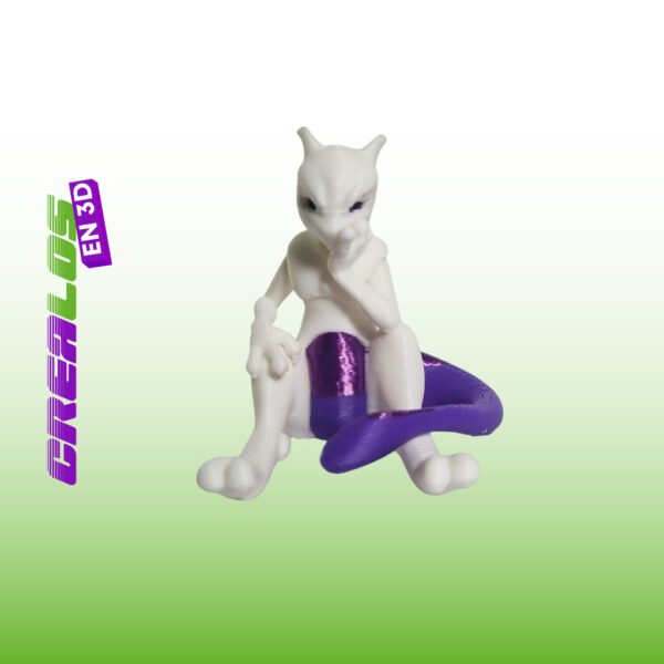 Figura impresa en 3D inspirada en Mewtwo (Pokémon). Diseño elegante en posición sentada, con cola morada brillante y detalles finos. Ensamblado a mano y listo para exhibición.