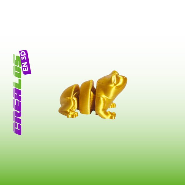 Figura ornamental de rana dorada, ideal para decoración, coleccionismo o regalos simbólicos asociados a la suerte y abundancia. Su acabado metálico dorado resalta sus formas y texturas, logrando un efecto llamativo. Fabricada en impresión 3D con materiales livianos y duraderos.